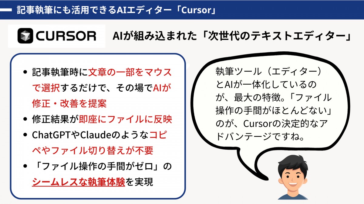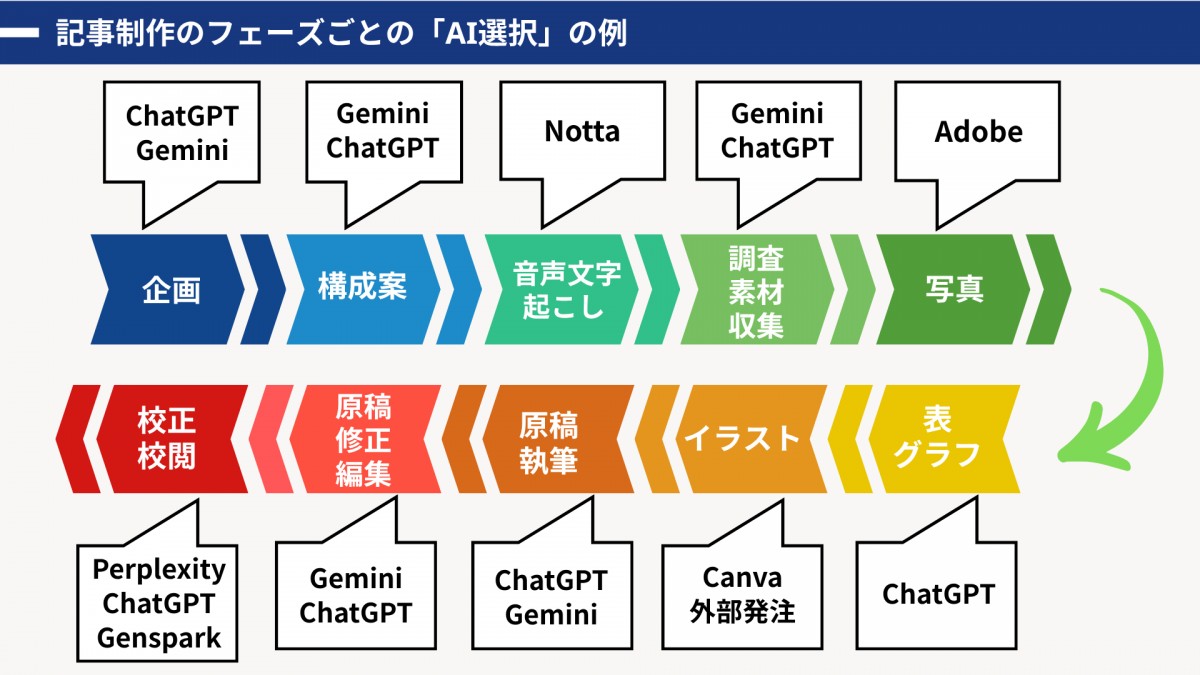 また、単なるAIツールの使用法だけでなく、複数のツールをどう組み合わせていけばいいのかという全体方針の考え方やAIが苦手な部分への対処の仕方など、さまざまな観点から「記事制作とAI」の関係が語られました。