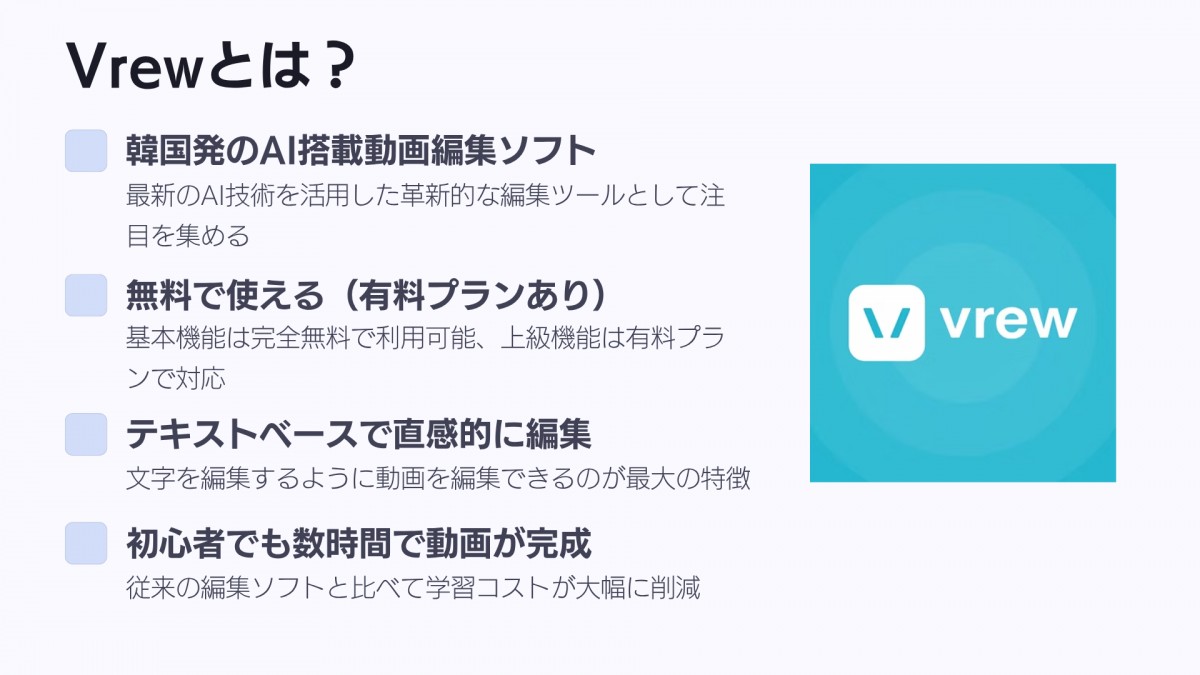Vrewは、文字ベースで直感的に動画を編集できます。そのため、初心者でも扱いやすく、動画編集に慣れていない人におすすめのツールといえます。